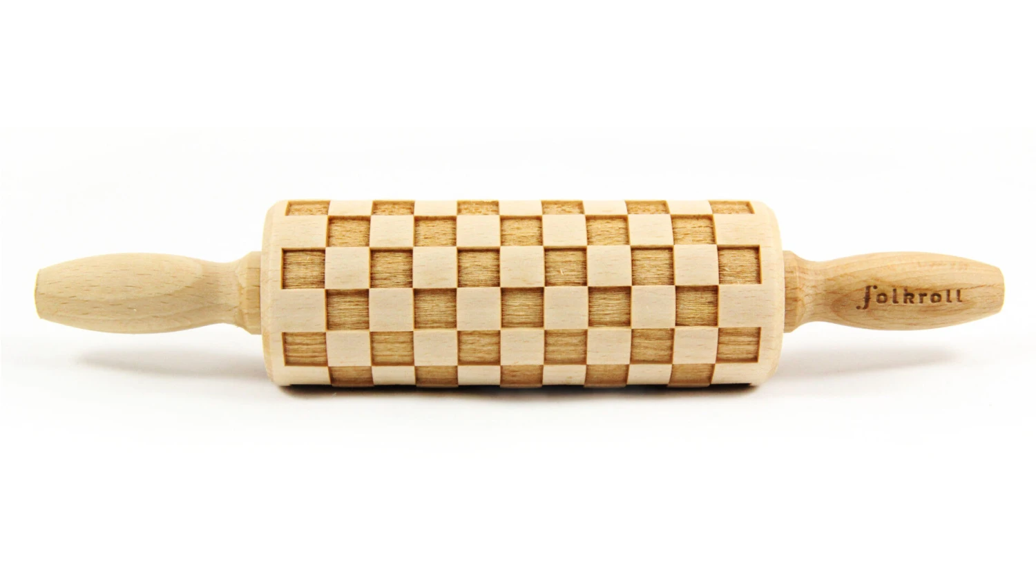 De Folkroll Junior-deegroller met het patroon Chess is vervaardigd uit beukenhout. Het bedrukte deel van de deegroller is 11,5 cm lang, en heeft een diameter van 4,5 cm. De gehele deegroller heeft een lengte van 23 cm. Gebruik de Folkroll-deegroller voor het decoreren van koekjesdeeg, chocolade, suiker, marsepein, zout, keramiek of kleiproducten.