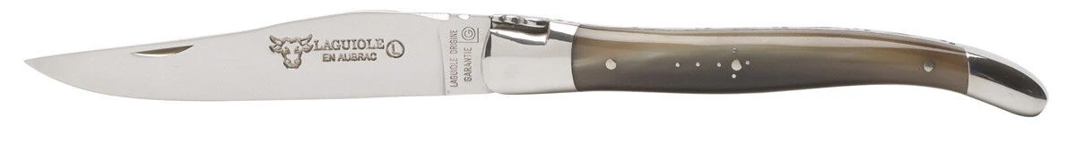 Het Laguiole en Aubrac klap-steakmes is vervaardigd uit messenstaal met een heft van beige hoorn. Het hoorn is voorzien van een Shepherd’s Cross, een van metaal ingelegd kruis. Hierdoor hadden katholieke herders altijd een kruis bij zich wanneer zij zich op de steppen bevonden.