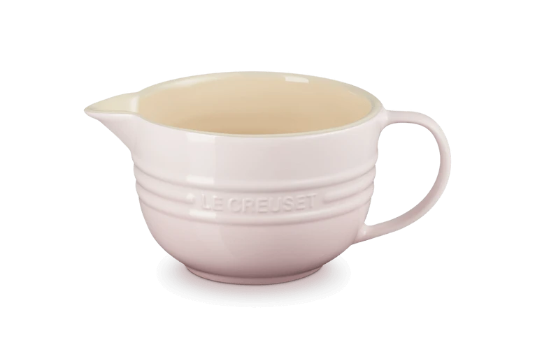 De ronde beslagkom van Le Creuset is gemaakt van roze geglazuurd aardewerk en heeft een diameter van 18,3 cm en een inhoud van 2 liter. De beslagkom heeft inclusief de greep een lengte van 26,1 cm. Gebruik de kom voor het mengen van beslag.