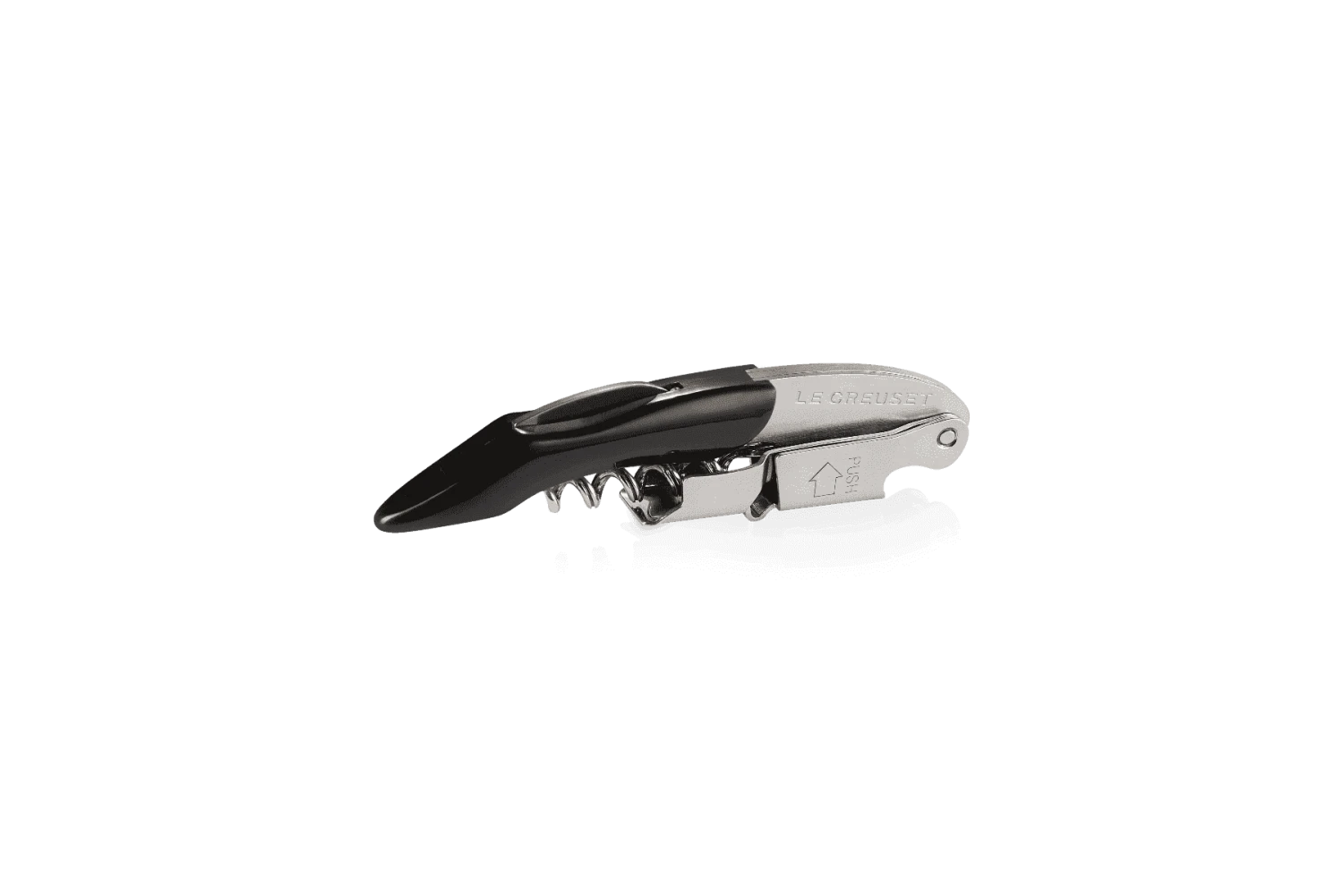Het roestvrijstalen kelnersmes van Le Creuset Screwpull heeft 3 functies: kurkentrekker, flessenopener en foliesnijder. U opent eenvoudig alle flessen door eerst het folie rond de hals van bijvoorbeeld de wijnfles door te snijden en vervolgens de kurk met de kurkentrekker te verwijderen.