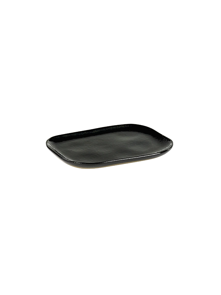 Het rechthoekige Merci bord van Serax is gemaakt van donkerblauw geglazuurd zandsteen. Het bord is 14,5 cm lang, 10,5 cm breed en 1,4 cm hoog.