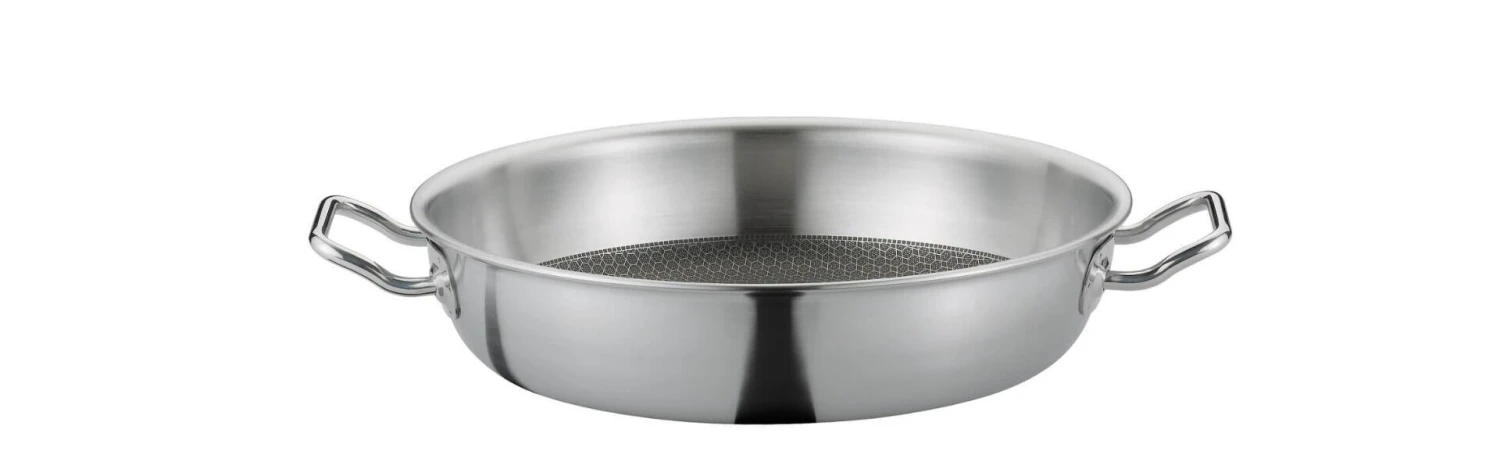 Het vijflaags materiaal van de koekenpan bestaat uit twee lagen roestvrij staal met een kern van drie lagen aluminium. Deze combinatie van materialen maakt de pan geschikt voor alle warmtebronnen, inclusief inductie. Tevens zorgt deze sandwich voor een snelle en gelijkmatige geleiding van de warmte, van het midden van de pan tot aan de rand.