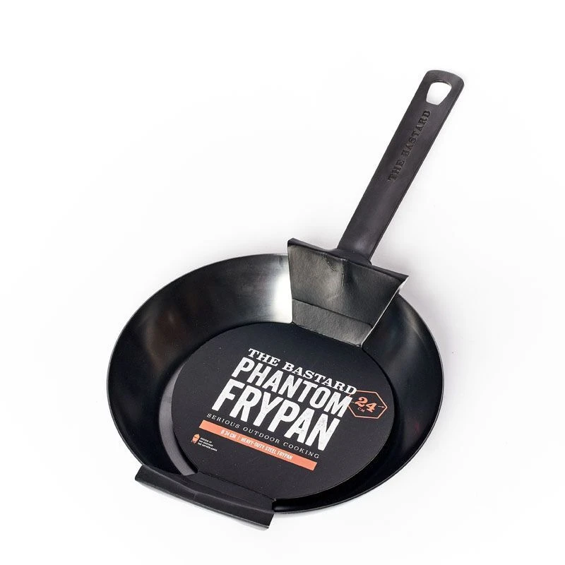 De The Bastard Phantom koekenpan heeft een diameter van 24 cm en is gemaakt van carbonstaal. Het oppervlak van de pan is genitreerd, het is sterk, roestvrij en gaat jaren mee. De Phantom pan is geschikt voor op hoog en direct vuur en heeft anti-aanbakwerking. Gebruik de koekenpan voor het bakken van diverse ingrediënten op de barbecue.