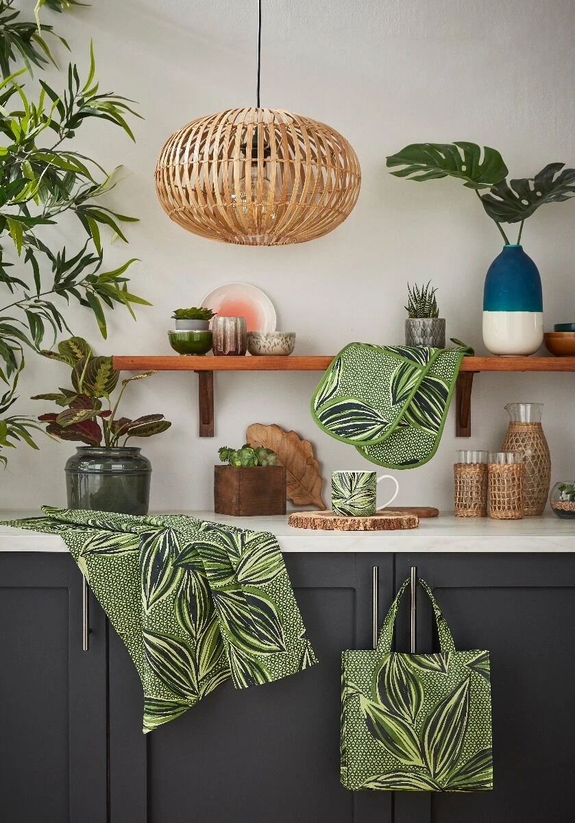 Het Ulster Weavers Geo Leaves schort is gemaakt van katoen. Gebruik het schort om uw kleding tegen spetters en vlekken te beschermen. Het Geo Leaves schort is voorzien van een afbeeldingen van bladeren met een groene ondergrond. Het schort is 95 cm lang en 70 cm breed.